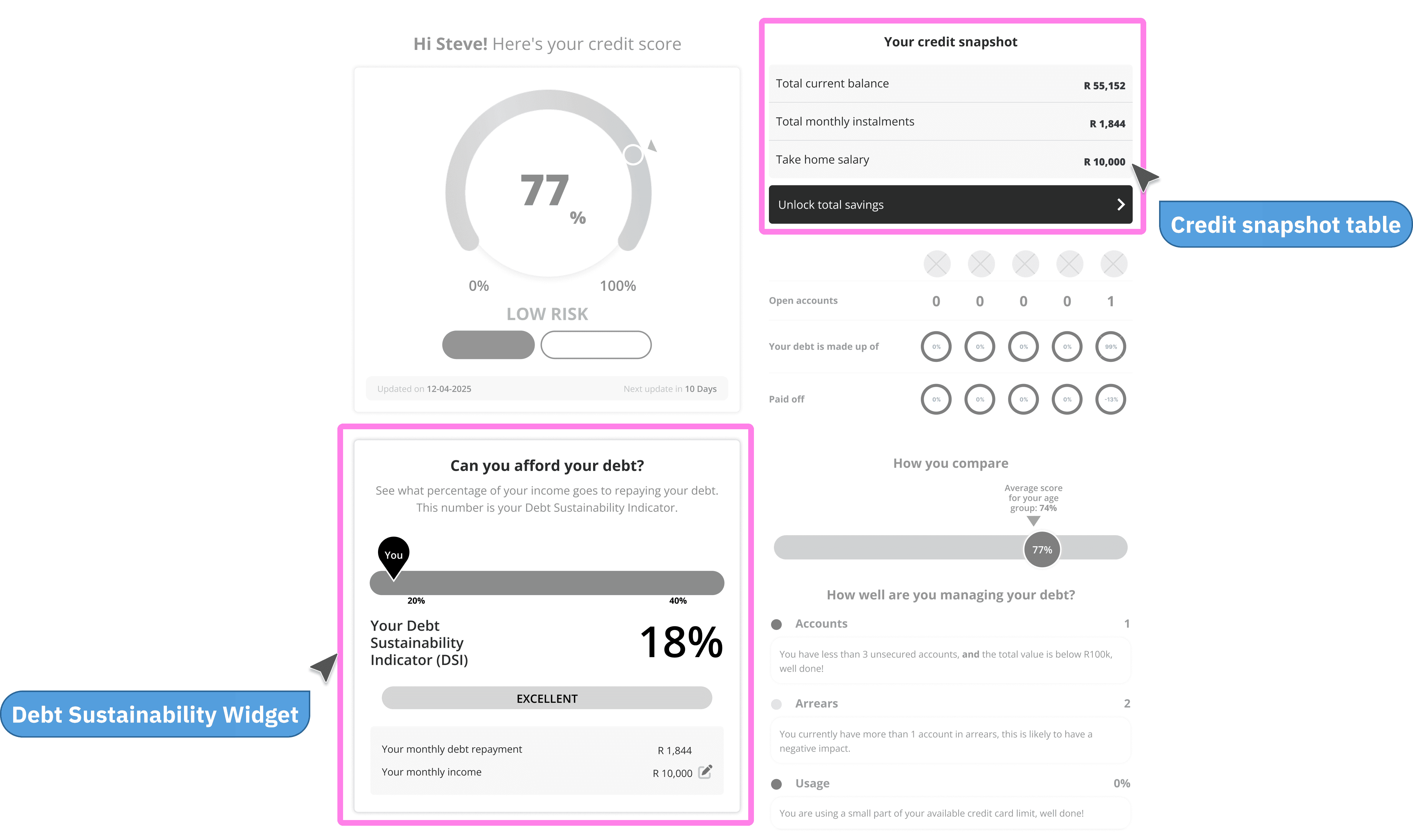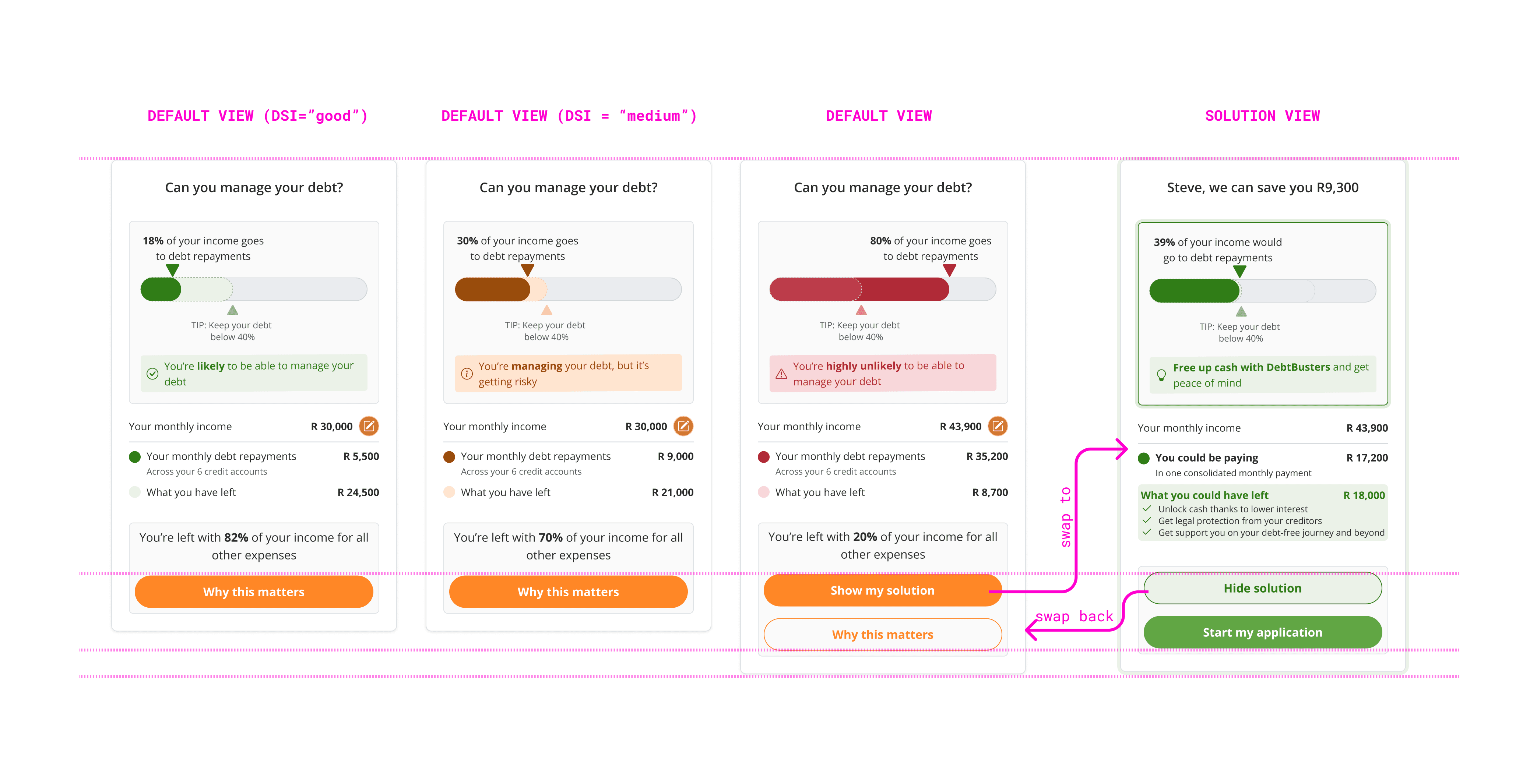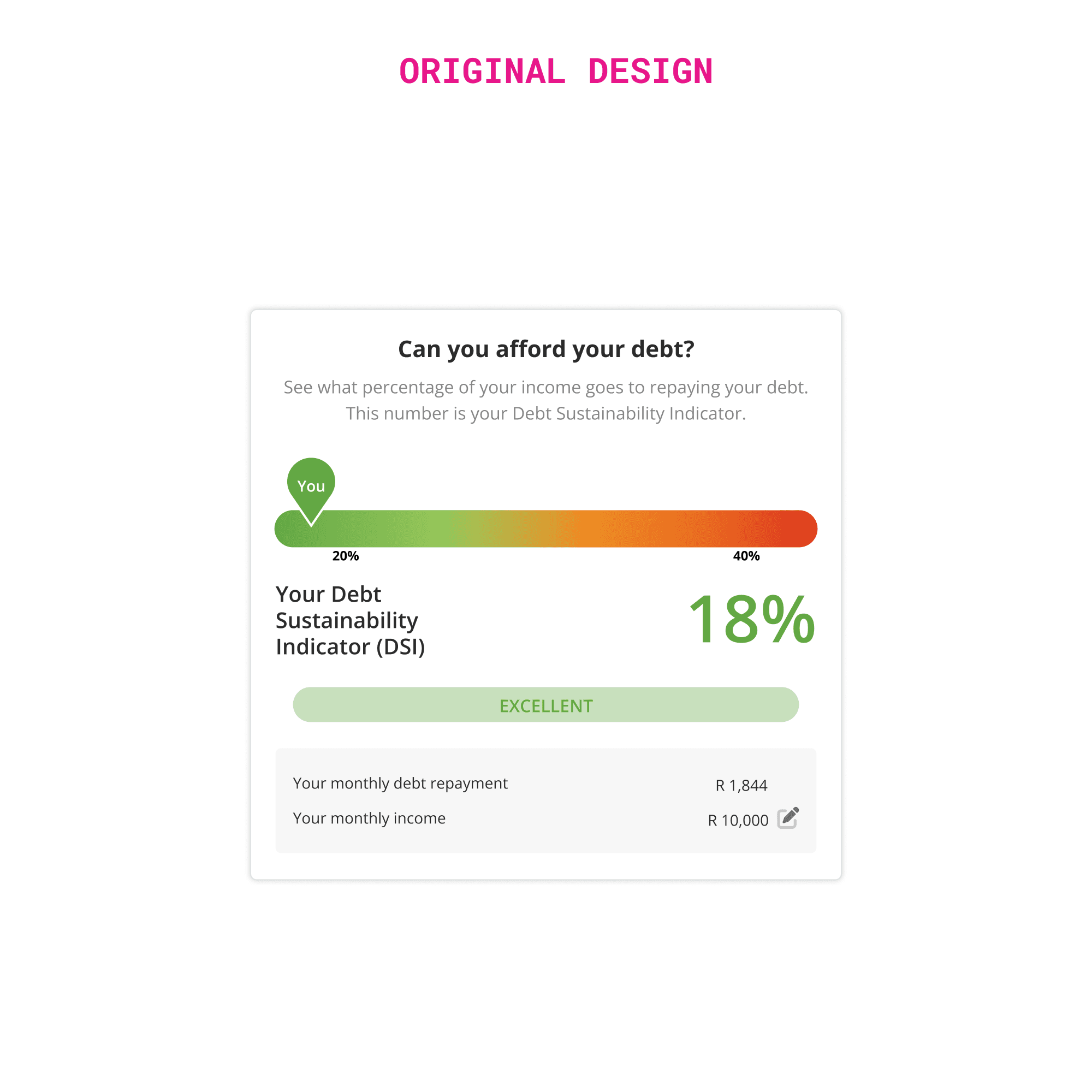 Coupled with an additional data point (the personalised quote based on a series of factors from a users' credit profile), we can show the user their current situation, and how it can be improved using the DSI widget.