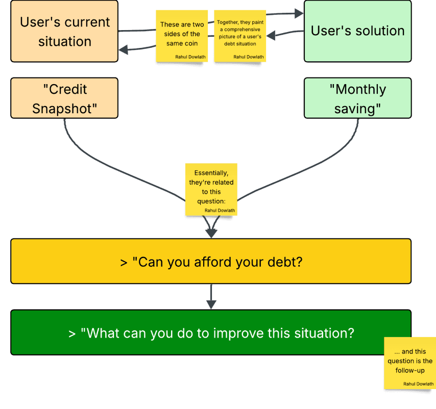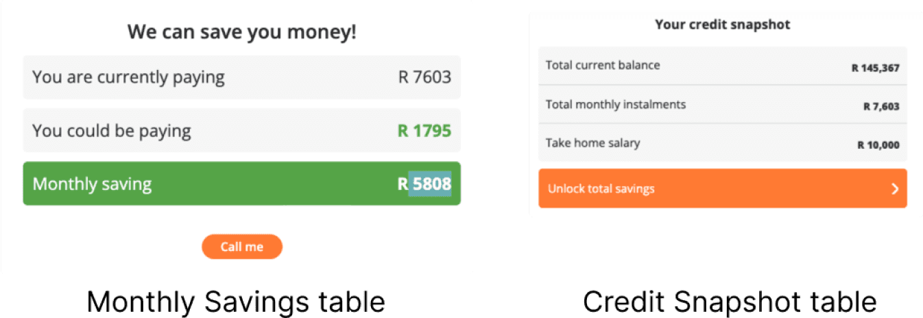 Merging monthly savings table from the Solutions page and credit snapshot table from the Dashboard page presents an opportunity to paint a clear picture about the user's situation and the brand's solution.