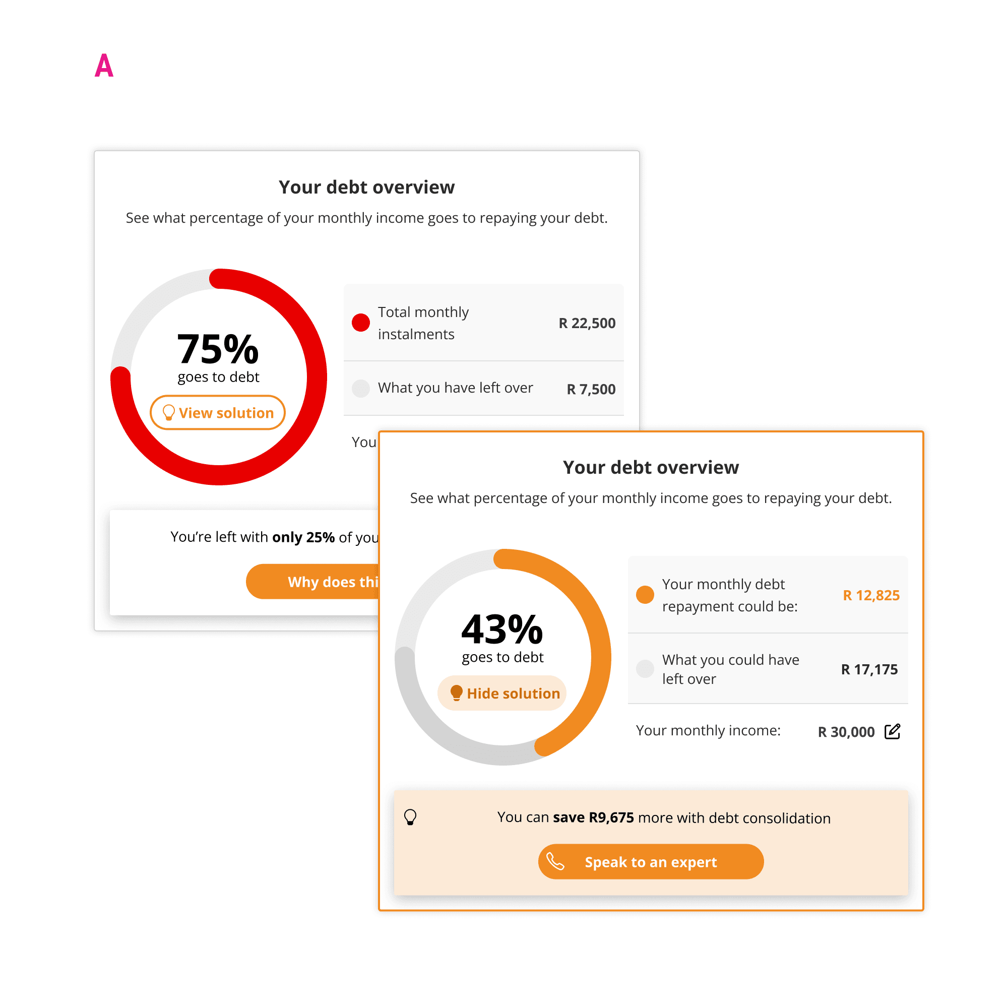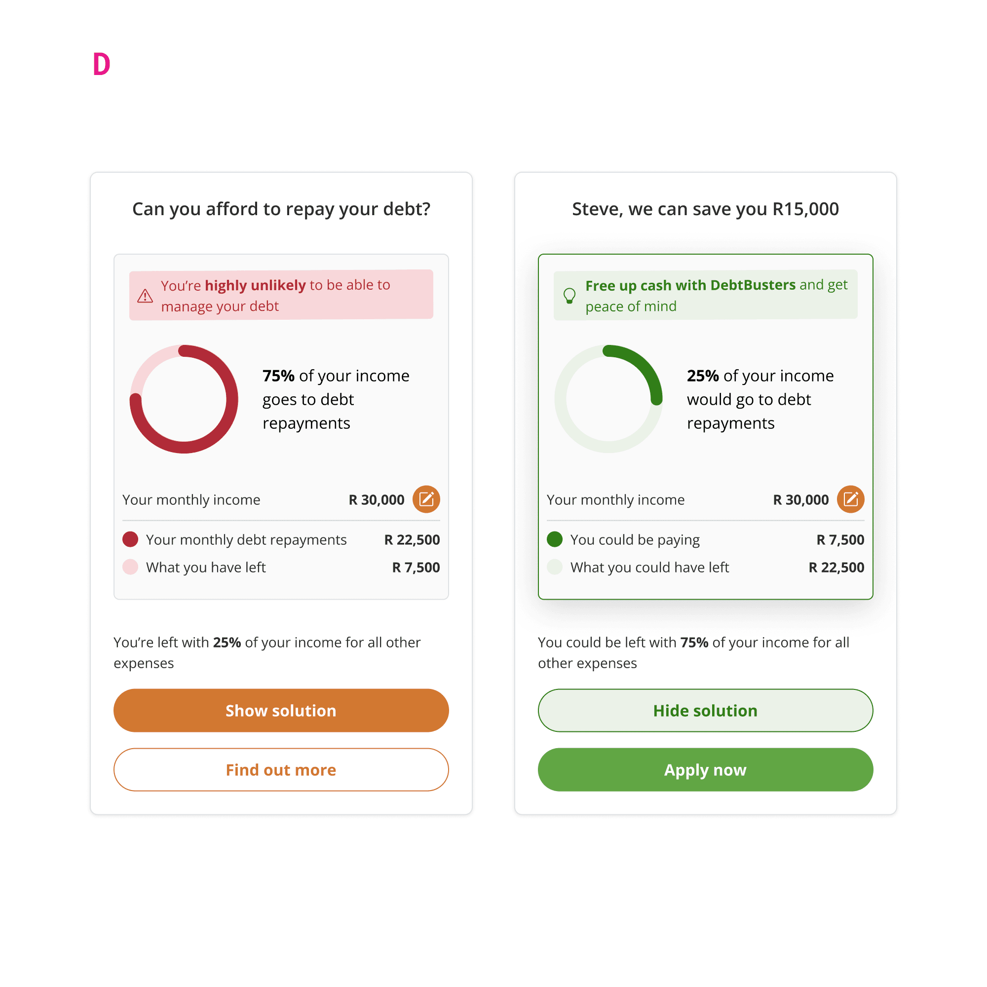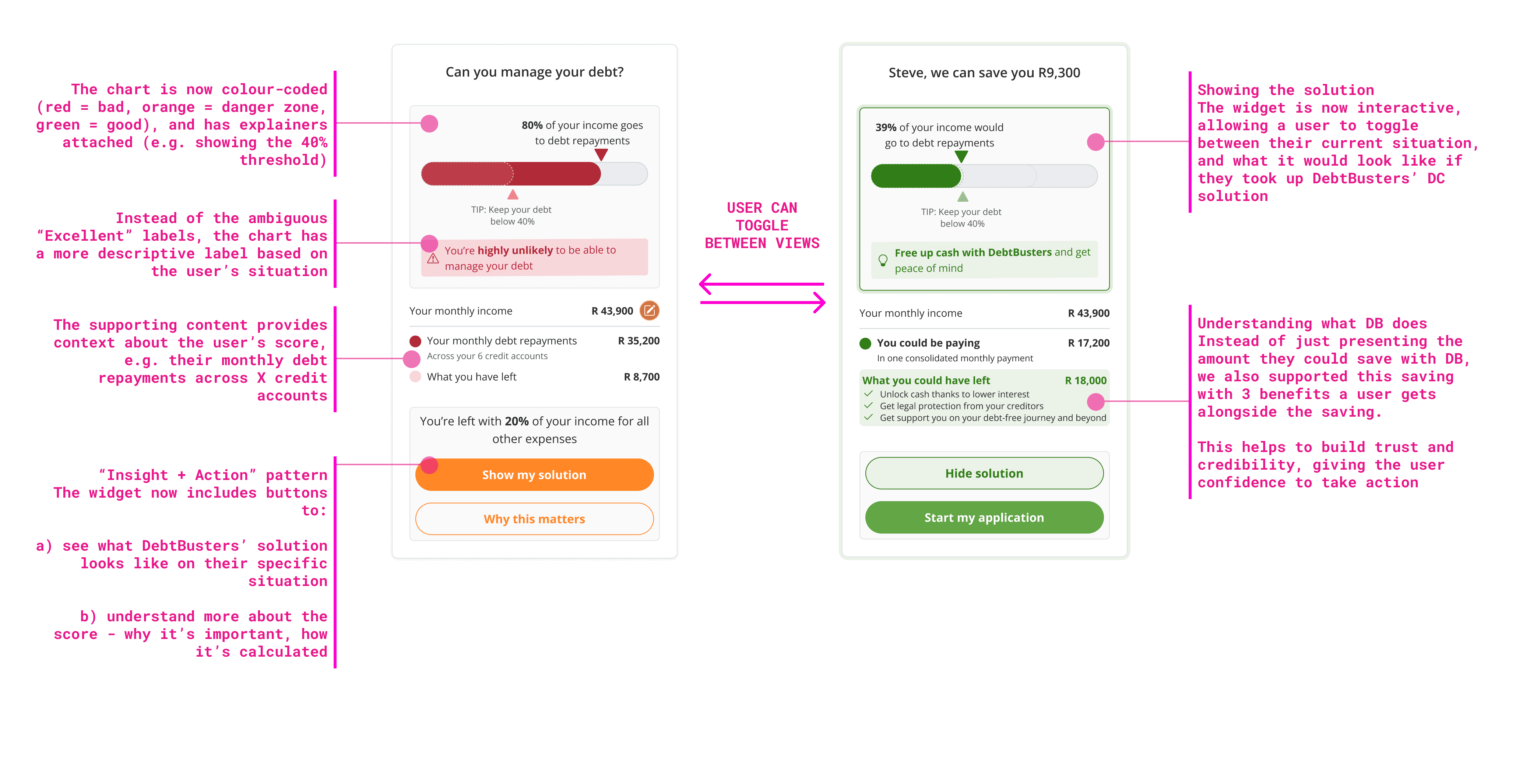 This is the dashboard page for DebtBusters' public-facing financial platform. Its goal is to illustrate a user's financial situation and where relevant, direct eligible users towards a call-back or online journey, converting them from lead to client. After user interviews revealed confusion with the narrative flow of information presented, two widgets were identified to help fix usability and clearly highlight the positive impact DebtBusters' consolidation solution can have on a users' debt situation.