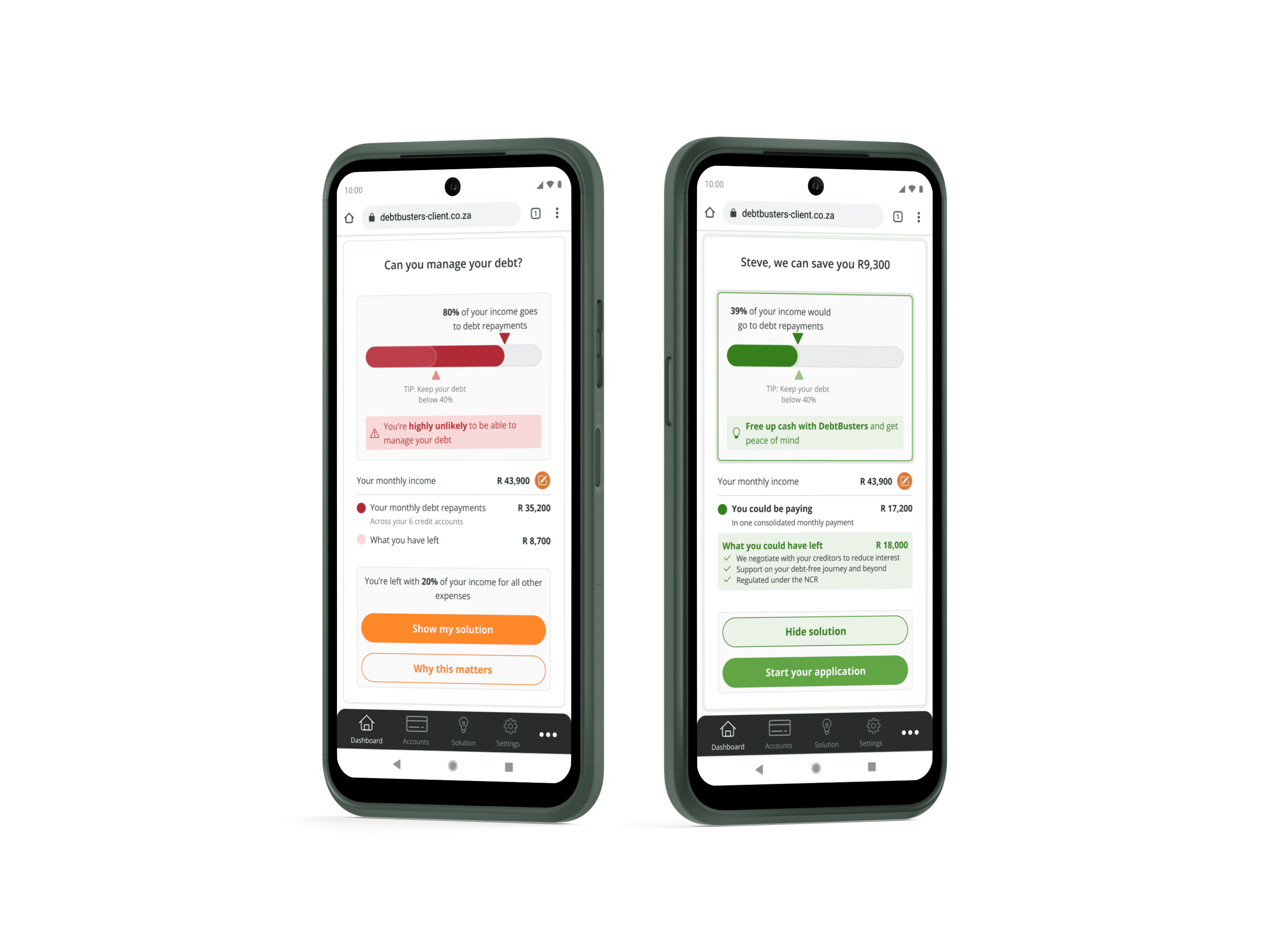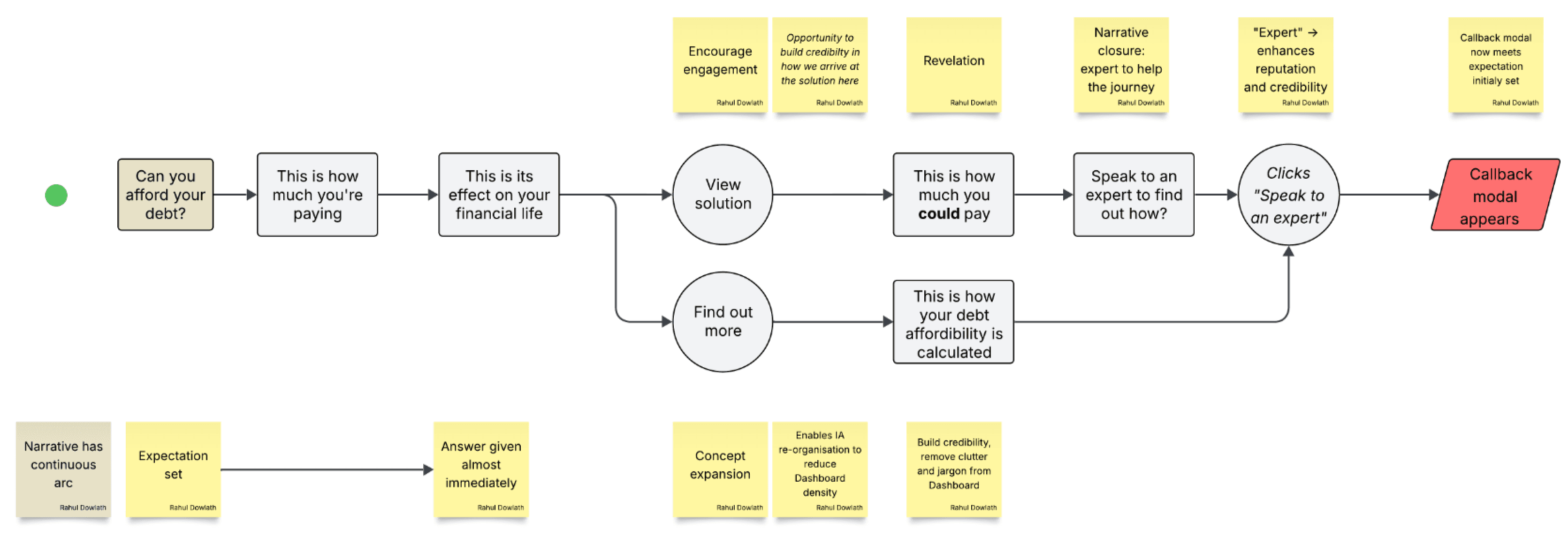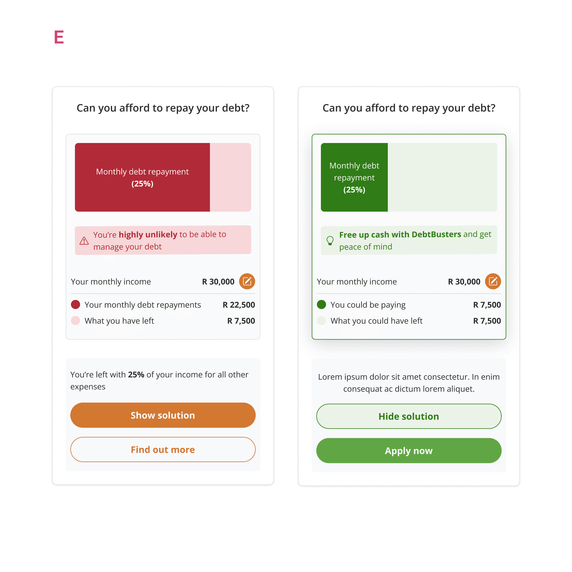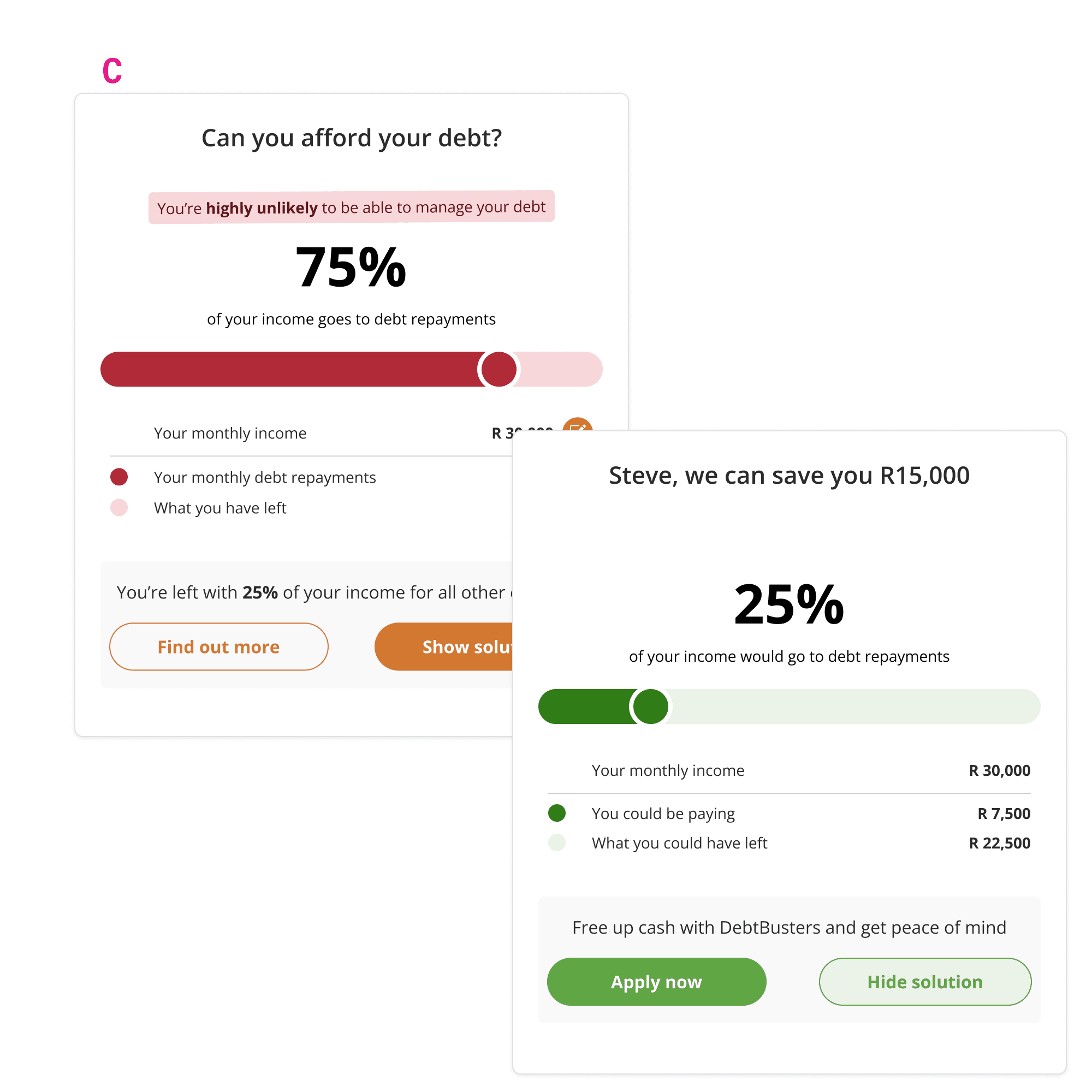 This is the dashboard page for DebtBusters' public-facing financial platform. Its goal is to illustrate a user's financial situation and where relevant, direct eligible users towards a call-back or online journey, converting them from lead to client. After user interviews revealed confusion with the narrative flow of information presented, two widgets were identified to help fix usability and clearly highlight the positive impact DebtBusters' consolidation solution can have on a users' debt situation.